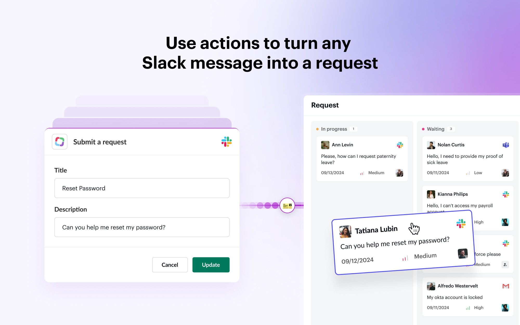 Siit allows you to submit and manage service requests directly in Slack. Siit's native Slack integration also enables you to turn DMs into tickets and keeps everyone informed on status without ever have to leave Slack.